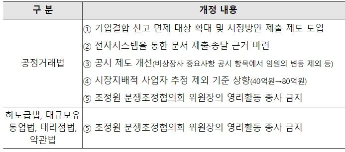 공정거래위원회는 기업결합 제도 개선, 공정위 심의절차 개선, 공시 제도 개선 등을 내용으로 하는 『독점규제 및 공정거래에 관한 법률』개정안 등 5개 법률 개정안이 2024년 1월 25일 국회 본회의를 통과했다고 밝혔다.