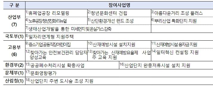 합동공모에는 산업부의 휴폐업공장리모델링, 청년문화센터 건립 등 7개사업을 비롯하여 고용부의 근로환경개선을 위한 중소기업 직장어린이집 지원, 산재예방시설 설치지원 등 6개 사업, 국토부의 일자리연계형 지원주택 등 6개 부처 18개 사업이 포함됐다.