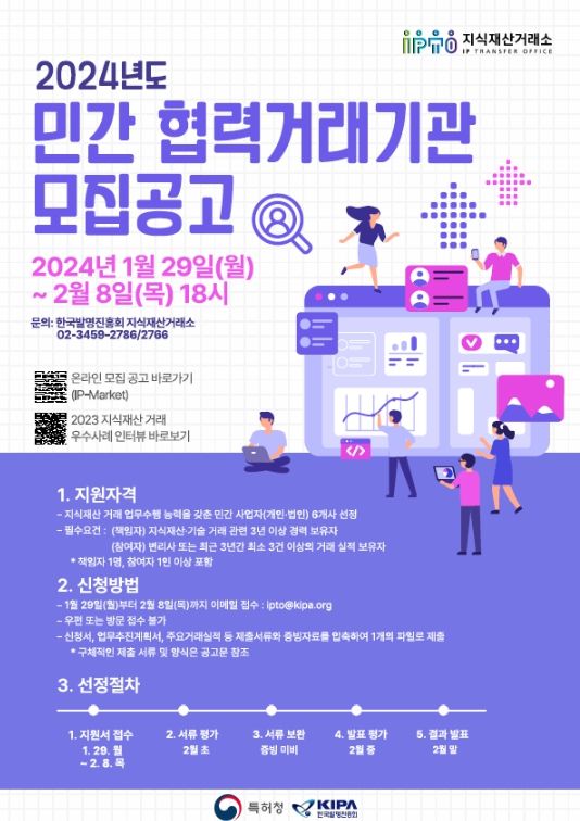 모집 대상은 지식재산 거래 업무수행 능력을 갖춘 민간 개인 사업자 또는 법인 사업자로, 참여를 희망하는 거래기관은 1월 29일부터 2월 8일까지 지식재산거래소 공식 이메일(ipto@kipa.org)로 신청할 수 있으며, 세부 사업공고는 한국발명진흥회 지식재산거래소 공지사항 게시판을 통해 확인할 수 있다.