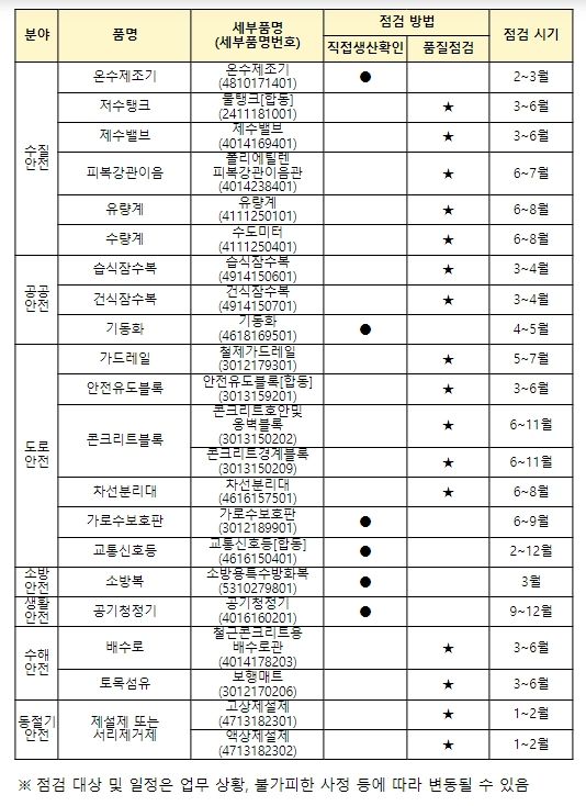 금년에는 수질, 도로, 소방 등 국민의 일상생활과 밀접한 7개 분야 22개 품목을 2024년 집중점검 대상으로 선정했다. 점검 대상에 대해서는 기업의 제조공장, 생산인력 등 직접생산 여부를 확인하고, 전문 검사기관에 품질시험을 의뢰해 안전과 품질의 이상 여부를 점검한다.