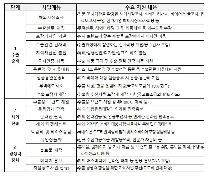 그 중, 수산식품 수출바우처는 지원규모를 이전 35개사에서 62개사로 대폭 확대하여 업체당 최대 2.2억 원을 지원하고, 국제식품박람회는 60개사에서 80개사로 확대하여 참가를 지원할 예정이다. 또한, 위험요소(리스크)안전망 구축의 경우 업체별 수출 보험 비용을 기존 최대 4천만 원에서 최대 6천만 원으로 확대 지원하고, 국제인증 취득 지원도 업체당 최대 5천만 원에서 최대 7천만 원으로 확대할 예정이다. 올해 처음으로 시행하는 라이브방송 연계 해외 마케팅 지원 사업의 경우, 60개사에 업체당 최대 8천만 원을 지원하여 해외 유명인사들과 함께 한국 수산식품을 홍보할 예정이다.