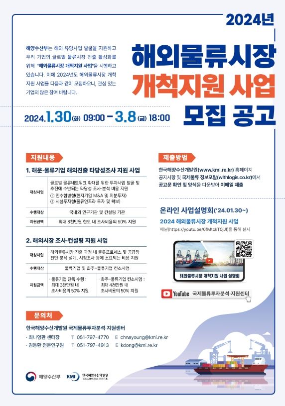[제주교통복지신문 송한신 기자] 해양수산부는 1월 30일부터 3월 8일까지'2024년도 해외물류시장 개척지원 사업'지원 대상기업을 모집한다.