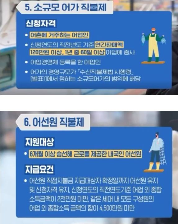소규모 어가 직불금은 어업인 간의 소득 격차 완화와 어가의 소득안정을 위해 정부가 영세한 어가에 지급하는 직불금이며, 어선원 직불금은 어선어업을 하면서 해양영토 수호와 해난 구조 등 공익기능도 함께 수행하고 있는 내국인 어선원에게 지급하는 직불금으로, 두 제도 모두 2023년에 처음 시행됐다.