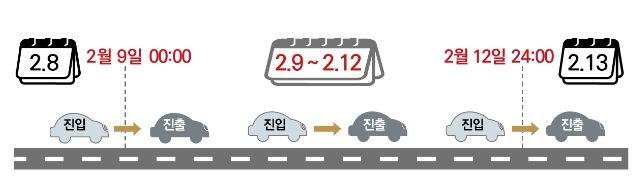 통행료 면제 기간 및 대상은 2월 9일 00시 새벽부터 2월 12일 24시 자정까지 잠시라도 고속도로를 이용하는 차량으로, 2월 9일 새벽에 고속도로를 진출한 경우 또는 2월 12일 밤에 고속도로에 진입한 경우도 면제 대상에 해당된다.