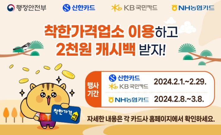 이번에 진행되는 행사에는 신한카드, KB국민카드, NH농협카드 3사가 함께하며 전국에 있는 착한가격업소 가맹점에서 해당 카드로 1만 원 이상 결제 시 2,000원 환급(캐시백) 혜택을 제공한다.