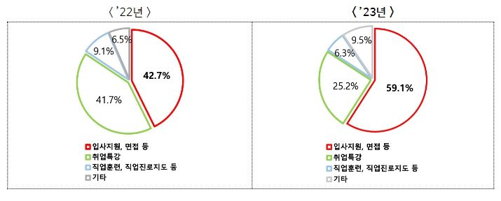 재취업률 상승에는 무엇보다 실업급여 수급자들의 적극적인 재취업 활동 증가가 주요했다. ’23년 수급자의 수급기간 중 재취업 활동 비중을 살펴보면 입사지원·면접·채용행사 등 직접 일자리를 찾기 위한 활동이 ’22년 42.7%에서 59.1%로 크게 증가했다.