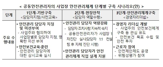이 사업의 핵심 역할을 할 공동안전관리자에 대한 지원방안은 업무수행 매뉴얼 제공 및 전문역량 배양 교육, 현장 직무교육(OJT) 등이 있으며,