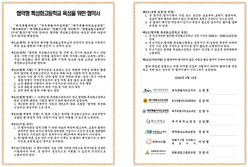 [제주교통복지신문 박희찬 기자] 제주지역 산업인재 양성을 위한 '협약형 특성화고등학교(항공우주 및 시설 분야)'추진을 위해 2월 19일 오후 5시 라마다 프라다 제주호텔에서 제주특별자치도청, 제주특별자치도의회, 제주특별자치도교육청, 제주대학교, 제주테크노파크, 한화시스템 주식회사, 한림공업고등학교 도내 7개 주요기관이 하나로 뭉친다.