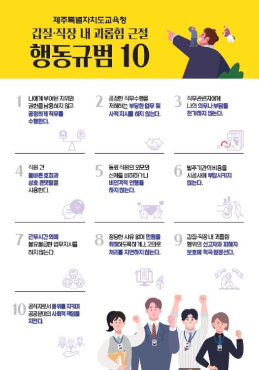 [제주교통복지신문 박희찬 기자] 제주특별자치도교육청은 상호 존중하고 공감하는 행복한 직장문화를 조성하기 위해 2024년 갑질・직장 내 괴롭힘 근절 계획을 수립하고 소속 기관 및 학교에 안내했다.