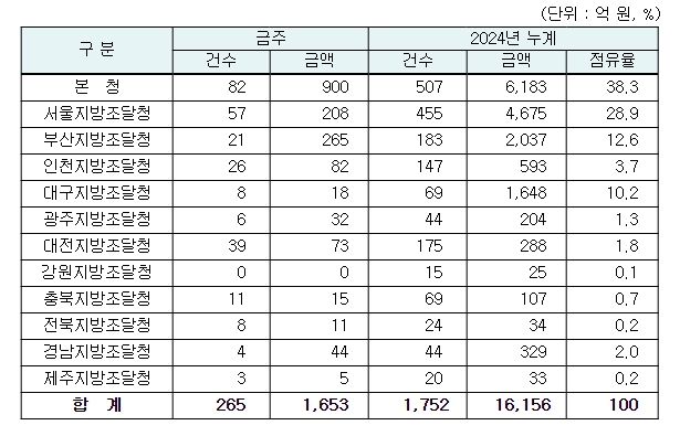 지역별 발주량을 보면 대전광역시 소재 본청 900억 원, 서울지방청 208억 원 등 2개청(1,108억 원)이 전체 금액(1,653억 원)의 67.0%를 차지하고 있으며, 인천 등 나머지 10개 지방청 545억 원이 각각 집행될 예정이다.