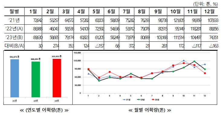반면, 오징어는 2.3만 톤(△36.2%), 청어 2.1만 톤(△23.3%), 참조기 1.5만 톤(△7.8%) 등으로 전년 대비 감소했다.