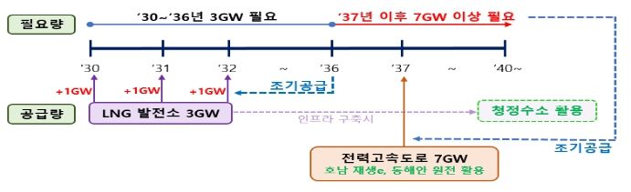 정부는 작년 12.21.(목) 「제4차 국가첨단전략산업위원회」에서 첨단전략산업 특화단지 전력공급계획을 심의한 바 있다. 동 계획에 따르면 산업부는 용인 반도체 특화단지에 ‘36년까지 액화천연가스(LNG)로 3GW, 나머지 7GW 이상은 ’37년 이후 서해안 초고압 직류망 등 장거리 송전선로를 통해 호남과 동해안의 발전력을 공급한다. 이를 위해 산업부는 「국가기간 전력망 확충 특별법」을 제정하여 전력망 적기건설을 위한 국가 지원체계를 도입하고, 관계기관 간 협력도 강화한다. 또한, 향후 첨단전략산업 특화단지 신규 선정 시 전력공급 여건 및 계획을 사전에 검토하는 체계를 확립하여 금년 상반기 바이오 특화단지 선정부터 적용할 계획이다.