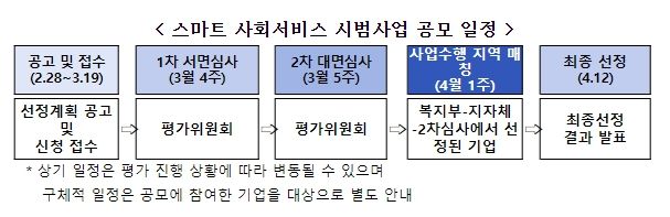 [제주교통복지신문 송한신 기자] 보건복지부는 2024년 신규사업인 ‘스마트 사회서비스 시범사업’에 참여할 기업을 선정하기 위해 인공지능(AI), 디지털, 로봇 등 첨단복지기술을 보유한 기업을 대상으로 2월 28일부터 3월 19일까지 공모를 실시한다고 밝혔다.