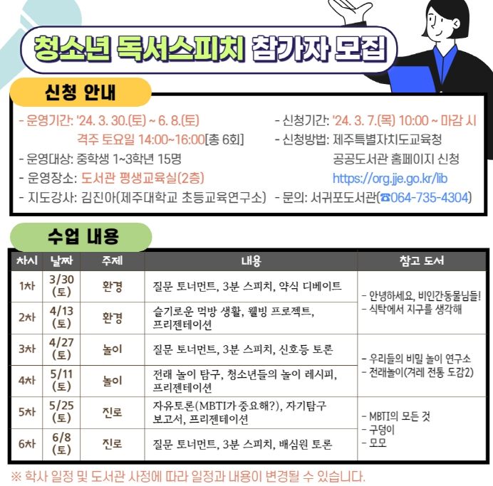 [제주교통복지신문 박희찬 기자] 서귀포도서관(분관장 김명희)은 스피치 기법을 익히며 발표력과 자신감을 키우는 기회를 마련하고자‘2024년 청소년 독서스피치’참가자를 모집한다.