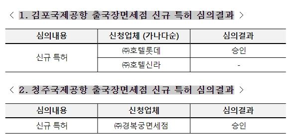 이번 특허심사위원회에서는 ①김포국제공항 출국장 면세점 신규 특허, ②청주국제공항 출국장 면세점 신규 특허 사업자 선정을 의결했다.