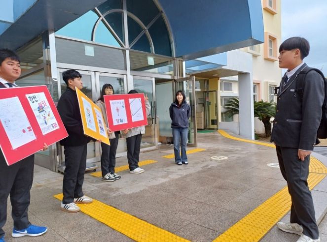 [제주교통복지신문 박희찬 기자] 무릉초중학교(교장 양성순)는 지난 4일부터 6일까지 담당 교사의 지도하에 학생 자치회 학생들이 아침 등교 시간(8:10~8:40)을 활용하여 학교폭력 예방 캠페인 등교 맞이를 했다.