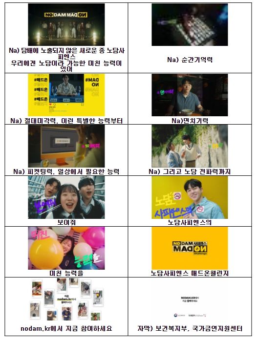 먼저, 통합미디어캠페인 부문 대상을 수상한 ‘노담사피엔스-매드온 챌린지’는 비흡연자를 매력적인 능력을 지닌 ‘노담사피엔스’로 새롭게 규정, 노담캠페인의 주인공으로서 자신이 지닌 ‘노담 능력’을 인증하고 공유하도록 한 참여형 통합미디어캠페인이다. ‘흡연하지 않는 나’에 대한 자부심을 노담 메시지에 담아냈을 뿐만 아니라, 흡연예방에 대한 국민의 자발적 참여를 이끌어낸 점이 높은 평가를 받았다.