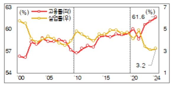 취업자수는 '22년(+103.7만명)ㆍ'23년(+31.2만명)의 높은 기저에도 불구하고,서비스업(+27.9만명)ㆍ건설업(+3.6만명)ㆍ제조업(+3.8만명) 모두 증가하며 2개월 연속 30만명 이상 증가했고, 계절조정 취업자수도 3개월 연속 전월대비 증가하는 등 견조한 고용흐름이 지속됐다.