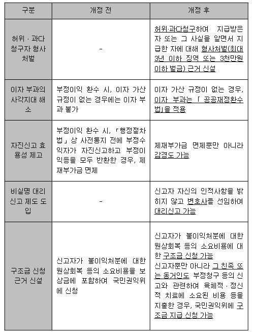 이번에 통과된 개정안에서는 공공재정지급금 부정수익자에 대한 제재를 보다 강화하고, 부정수급 신고자에 대한 지원은 확대했다.