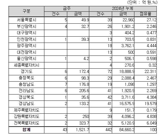 지역별로는 전북특별자치도 324억 원, 강원특별자치도 250억 원, 전라남도 206억 원, 그 밖의 지역이 742억 원이다.