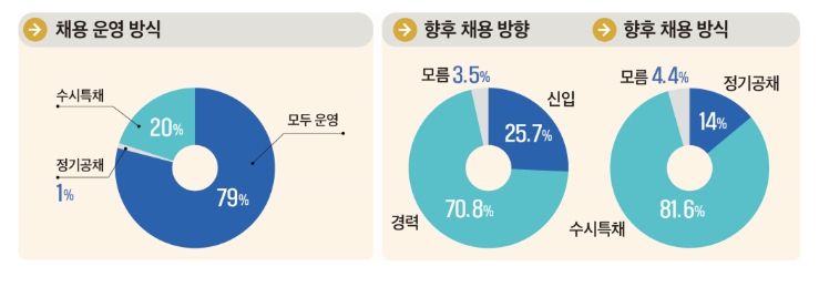 이번 조사 결과, 기업들의 직무중심 채용 경향이 뚜렷했다. 응답기업 중 79%가 작년 하반기 정기공채와 수시특채를 병행했으며, 기업들 대다수는 향후 수시특채(81.6%), 경력직 채용(70.8%)이 더 확대될 것이라고 예상했다. 평가기준은 학교·전공·학점 등 스펙(36.2%)보다는 직무경험·경력 등 직무능력(96.2%)이 중요하며, 채용전형 중 서류․필기보다는 면접 중심(92.1%)으로 채용한다는 대답이 압도적이었다.