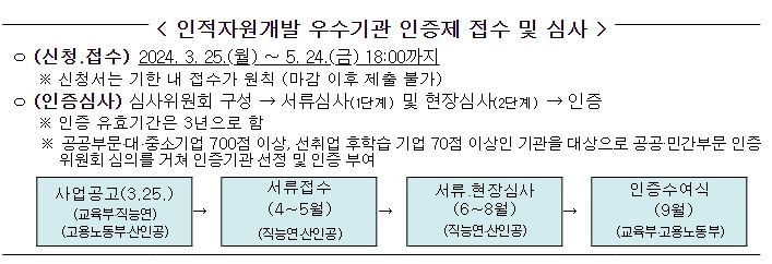 [제호고용노동부와 교육부는 3월 25일 ‘2024년도 인적자원개발 우수기관(Best HRD) 인증’ 선정 계획을 공고한다.