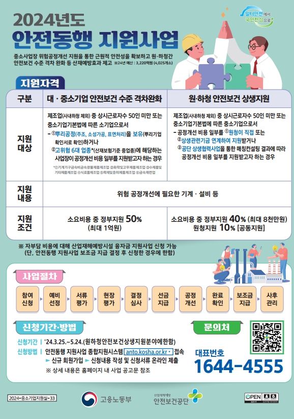 고용노동부와 안전보건공단(이사장 안종주)이 시행하는 안전동행 지원사업(‘24년 4,000여 개소 지원, 3,220억원)은 상시근로자 50명 미만 제조업 사업장 등이 기계‧설비로부터의 재해 위험을 근원적으로 줄이기 위한 공정개선을 하고자 하는 경우 소요 비용(비용의 40%~50%, 최대 1억원)을 지원받을 수 있는 사업이다.