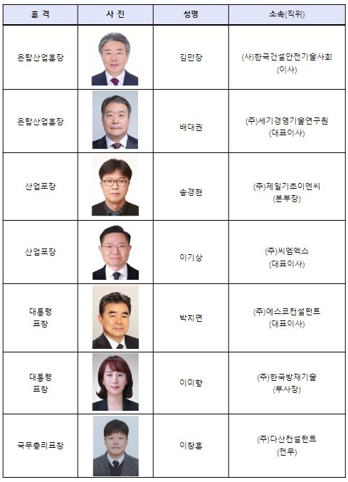 은탑산업훈장은 건설공사의 안전컨설팅과 안전진단 평가모델 구축 등 국내 건설안전 발전에 공헌한 김만장 (사)한국건설안전기술사회 이사와 난방에너지 절감과 층간소음문제 해결을 위한 연구개발 및 건설산업 품질경영체계 확립에 기여한 배대권 세기경영기술연구원 대표이사 등 2명에게 수여된다.