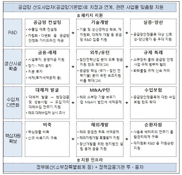 산업부는 이들 프로젝트의 공급망 안정화를 관계부처·기관 등과 협업하여 적극 검토/추진하기로 하였다. 먼저, 기술개발, 생산투자, 대체처, 비축 등 공급망 종합 지원사업 메뉴판을 마련하고 맞춤형으로 패키지 지원한다. 국내 생산시설 확충을 위한 재정·금융·세제 등 추가 지원방안도 검토한다. 또한, 수급 위험이 큰 품목은 연간 수급관리계획을 수립해 공공비축 확대, 민간 재고 확보 등을 선제적으로 추진하다. 아울러, 프로젝트별로 업계-지원기관 등으로 민관 합동 공급망 얼라이언스를 구성해 공급망 안정화 과제 및 애로를 상시 발굴하고, 금융, 무역, R&D, 핵심광물 등 관계기관으로 공급망 지원기관 협의체를 운영해 이를 신속히 해결해 나간다.
