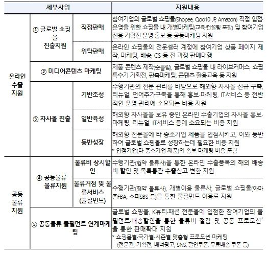 매체제작물(미디어콘텐츠) 홍보(마케팅) 사업은 중소기업 제품 제작물(콘텐츠) 제작 및 국제글로벌쇼핑몰 내 라이브커머스와 기획전 개최 등을 지원한다. 자사몰 진출 사업은 중소기업의 해외향 자사몰 구축, 리뉴얼 등을 지원한다. 또한, 공동물류 지원사업에서는 물류비 할인 및 물류일괄처리(풀필먼트) 이용료 등을 지원한다.