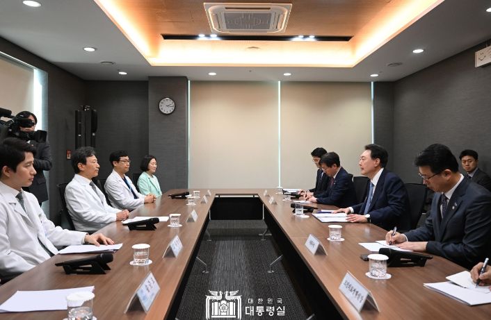 한편, 대통령이 간담회를 마치고 병원을 나오자, 의료진이 입구에서 서서 대통령에게 “건강하시라” “힘내시라”고 응원했고 대통령은 “의료현장을 지켜주셔서 더할 나위 없이 감사하다”고 답했다.