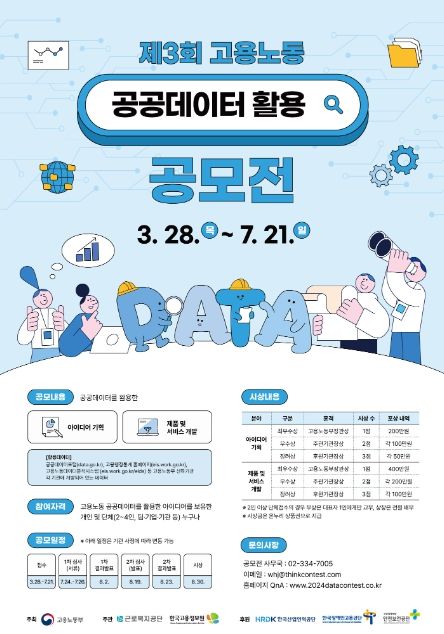 [제주교통복지신문 송한신 기자] 한국고용정보원(원장 김영중)과 근로복지공단(이사장 박종길)은 3월28일부터 '제3회 고용노동 공공데이터 활용 아이디어 공모전'을 공동으로 개최한다고 밝혔다.