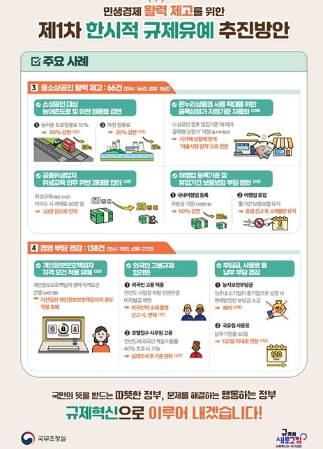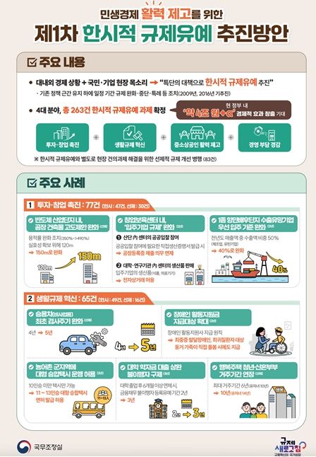 [제주교통복지신문 송한신 기자] 정부(국무조정실장 : 방기선)는 민생경제 활력 제고를 위한 ‘제1차 한시적 규제유예 방안’을 추진한다.