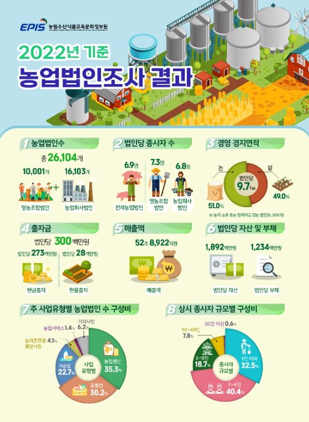 [제주교통복지신문 송한신 기자] 농림축산식품부는 '2022년 기준 농업법인조사' 결과를 발표하면서, 농업법인 수는 26,104개로 집계됐고 농업법인 총매출액은 52조 8,922억원으로 ‘21년 대비 7.6% 성장했다고 밝혔다.