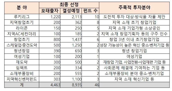 이번 출자사업은 4,463억원을 출자해 46개 기금(펀드) 8,935억원 규모의 벤처기금(펀드)을 선정했다. 신속한 벤처기금(펀드) 결성과 투자금 공급을 위하여 1분기 내 선정을 완료한 것이다.