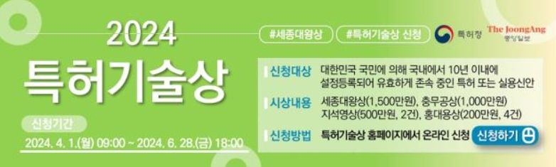 [제주교통복지신문 송한신 기자] 특허청은 4월 1일부터 6월 28일까지 기술혁신에 초점을 둔 ‘2024년 특허기술상’ 신청 접수에 들어간다고 밝혔다.