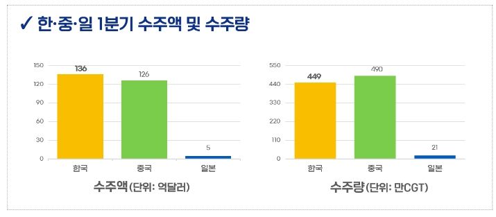 영국의 조선·해운 시황 분석기관 클락슨리서치(’24.4.2일 기준)에 따르면 ’24.1분기 우리나라 선박 수주액은 136억 달러로 전년동기대비 41.4% 증가하면서 중국 선박 수주액인 126억 달러를 앞질렀으며, ’24.1분기 전세계 수주의 약 44.7%를 점유하면서 국내 조선소 순위가 바로 세계조선소 순위가 되는 조선산업의 신화를 이어 나가고 있다. ’24.1분기 수주량의 경우 우리나라는 449만CGT(표준환산톤수)로 중국(490만CGT) 보다 다소 적지만 전년동기대비 한국은 32.9% 증가, 중국은 0.1% 감소하여 한국 조선산업은 성장세를 이어 갔다.