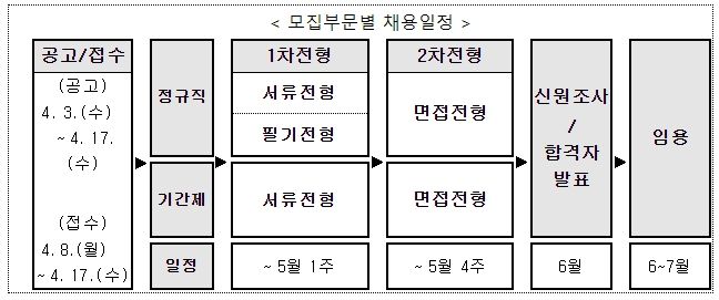 채용절차는 서류전형, 필기전형(정규직에 한함), 면접전형으로 진행되며 지원자의 전문역량을 면밀히 확인하여 직무 수행에 적합한 우수한 인재를 선발할 예정이다.