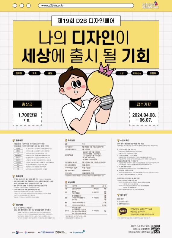 올해 19회째를 맞은 디투비(D2B) 디자인 페어는 참여기업에 창의적이고 우수한 디자인을 공급하고, 디자이너에게는 디자인의 권리화∙사업화 과정을 직접 경험할 수 있는 기회를 제공하기 위한 공모전이다.