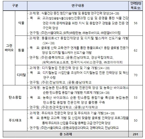 이 사업은 기술혁신을 통한 농산업 패러다임을 전환하기 위해 농과대학을 주관연구기관으로 타 대학, 다학제가 함께 참여하여 지역간·기술간 협업을 통한 융복합 연구인력 양성과 혁신기술 개발을 목표로 하고 있으며, 교육과정 운영비, 연구활동비 등 연구팀당 5년간 57억원을 지원받게 된다.