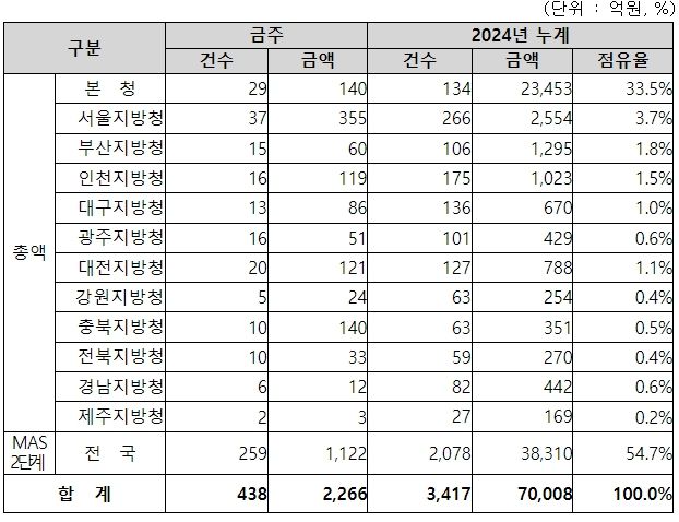 지역별 발주량을 보면, 총액계약 대상 1,144억 원 중 본청이 140억 원으로 12.2%를 집행하고 서울청 등 11개 지방청에서 1,004억 원을 각각 집행할 예정이다.