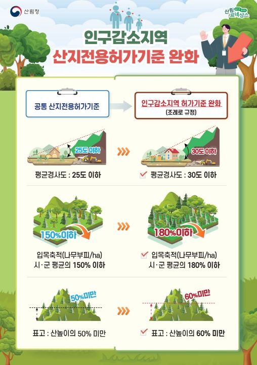 또한 올해 ‘산지관리법 시행령’을 개정해 인구감소지역에 한해 지방자치단체 조례로 산지전용허가 기준을 완화할 수 있는 범위를 현행 10%에서 20%로 확대할 예정이다.