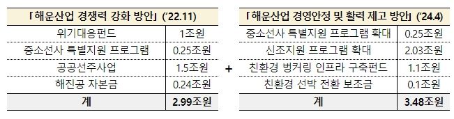이에 정부는 선사별 맞춤형 위기대응 체계를 구축하여 국적선사의 경영악화를 사전에 방지하고, 친환경 규제와 환경‧사회‧투명경영(ESG) 경영 확산에 선제적으로 대응할 수 있도록 민간 자본의 친환경 선박 투자를 활성화하여 수출입 물류 등 우리나라의 해상공급망을 강화하고자 이번 방안을 마련했다. 이번 방안은 「해운산업 경쟁력 강화방안(‘22.11)」에 따른 약 3조 원 규모의 경영안전판에 더하여, 국적선사의 체질을 개선하고 글로벌 규범을 선도하기 위해 약 3.5조 원을 추가 투자하는 계획이다.