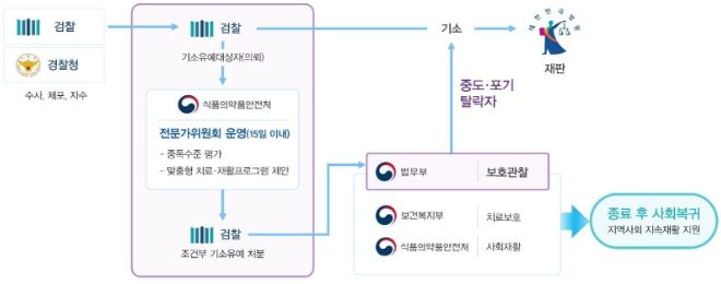 한편, 치료가 필요한 중독자는 치료보호제도와 적극 연계합니다. 전문가위원회를 통해 치료 연계 판단 시 검사의 의뢰를 통해 치료보호심사위원회를 거쳐 치료를 제공함으로써 원스톱 치료 지원도 추진한다.