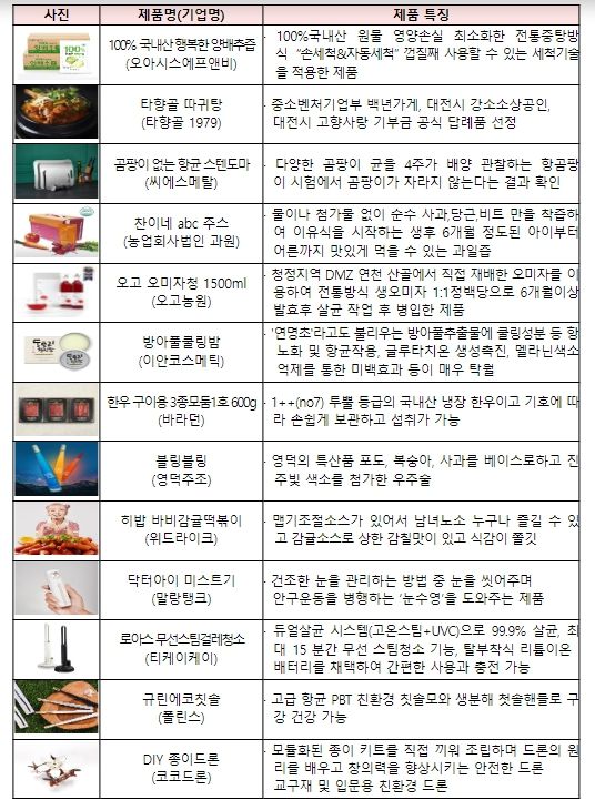 이어진 상품기획가(MD) 등 민간 전문가들의 시장·상품경쟁력, 가격 적정성, 가치성 등 적격성 평가를 통해 우수한 제품을 가진 중소기업·소상공인 300개사를 최종 선정했으며, 백년가게 제품(따귀탕), 건강쥬스, 떡볶이 등 온 가족이 함께 즐길 수 있는 식품·간식류와 안구 미스트기, 종이드론, 에코칫솔 등 혁신 제품군들이 선정됐다.