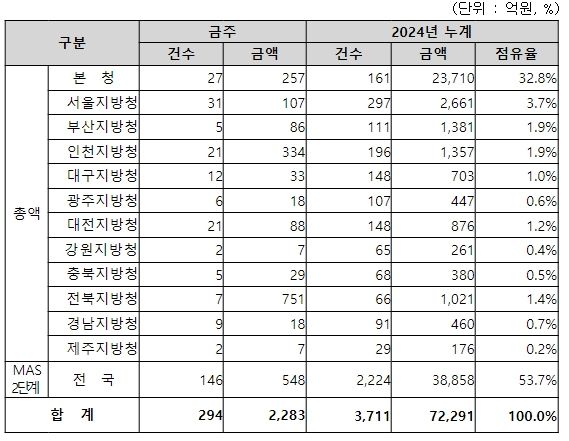 지역별 발주량을 보면, 총액계약 대상 1,735억 원 중 본청이 257억 원으로 14.8%를 집행하고 서울청 등 11개 지방청에서 1,478억 원을 각각 집행할 예정이다.