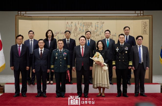 대통령은 이어진 환담에서 군 최고의 계급인 대장으로 진급한 강호필 신임 합참차장과 배우자에게 축하와 감사를 전하며, 어느 때보다 엄중한 안보 상황 속에서 북한이 감히 우리를 넘보지 못하도록 확고한 대비 태세를 유지할 것을 강조했다.