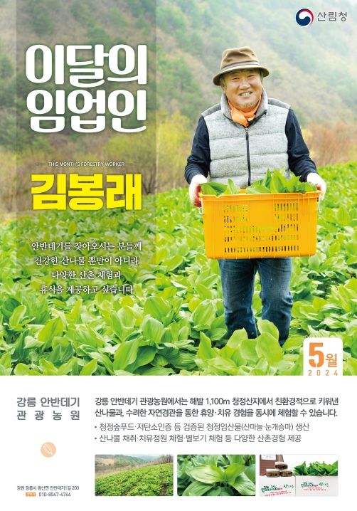 [제주교통복지신문 송한신 기자] 산림청은 ‘이달의 임업인’으로 강원 강릉의 ‘안반데기’에서 산나물을 재배하는 임업인 김봉래(58세, 강릉안반데기관광농원) 대표를 선정했다고 2일 밝혔다.