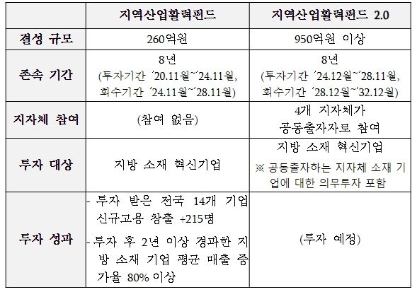 [제주교통복지신문 송한신 기자] 산업통상자원부는 지방 유망기업의 기술사업화를 지원하기 위해 ‘지역산업활력펀드 2.0’을 조성한다. 이는 2020년 조성된 지역산업활력펀드가 금년 11월 투자가 종료됨에 따른 후속 신규 펀드로, 기존보다 규모를 약 4배 확대(260억 원→950억 원 이상)했고 충남, 전북, 전남, 경북 등 4개 지방정부가 출자에 참여한다.