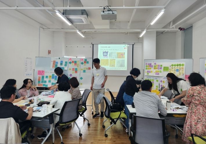 전남대학교 김남기교수의“디자인 씽킹(현재의 상태를 더 나은 상태로 변화시키기 위한 모든 변화의 시도)을 활용한 공감 기반 문제 발견과 해결”을 주제로 진행된 연수는 △디자인 씽킹 소개와 이해 △디자인 씽킹 과정 △ 공감을 기반으로 한 문제 정의 △아이디어 발산 및 수렴 등의 내용으로 구성됐다.